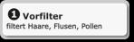 2 x Grobstaub, 2 x Kupferfiltervlies, 2 x HEPA 13 ,2 x Kohlefilter und 2 x UVC (zuschaltbar)